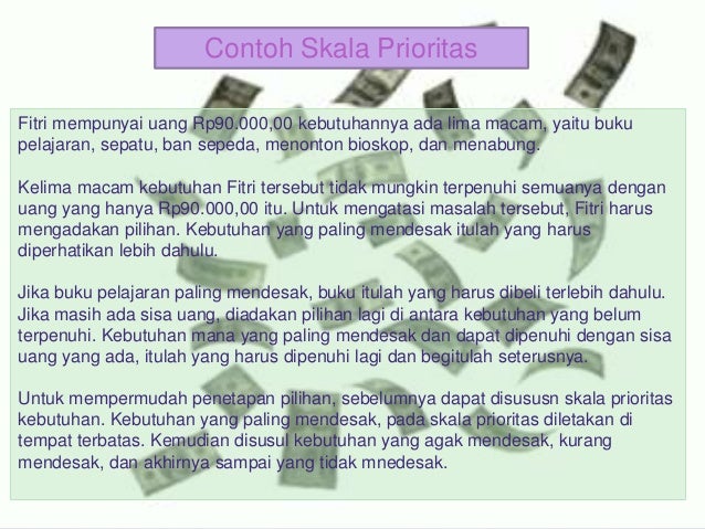 Skala prioritas adalah suatu daftar bermacam macam kebutuhan yang disusun berdasarkan tingkat kepentingannya,yaitu dari yang paling penting sampai dengan kebutuhan yang dapat ditunda pemenuhannya. 2.3 status atau peran dalam keluarga. Selasa, 06 november 2018 ekonomi, ips kelas 8 edit. Dengan mengetahui skala prioritas maka diharapkan anda bisa mengetahui mana saja skala prioritas yang. By azzahra rahmah posted on february 5, 2020. Pengertian skala prioritas dalam ilmu ekonomi skala prioritas adalah daftar yang memuat segala macam kebutuhan kita yang diururkan dari yang paling mendesak hingga yang dapat dipenuhi nanti. Pengertian skala prioritas bisa dijelaskan sebagai suatu klasifikasi atau pengurutan kebutuhan yang disusun berdasarkan kebutuhan yang paling penting pada bagian atas hingga kebawah. Pengertian skala prioritas menurut para ahli : 2008) pengertian skala prioritas adalah level atau tingkatan kondisi untuk menentukan dan membandingkan seberapa besar dan seberapa pentingnya hal tersebut harus dilakukan. Skala prioritas dan cara menyusunnya. Skala prioritas kebutuhan adalah urutan kebutuhan yang disusun berdasarkan tingkat kepentingan kebutuhan. Kebutuhan yang lebih penting dan mendesak harus didahulukan dibandingkan dengan kebutuhan yang tidak penting dan tidak mendesak. Langsung saja kita bahas contoh penyusunan skala prioritas berikut ini: